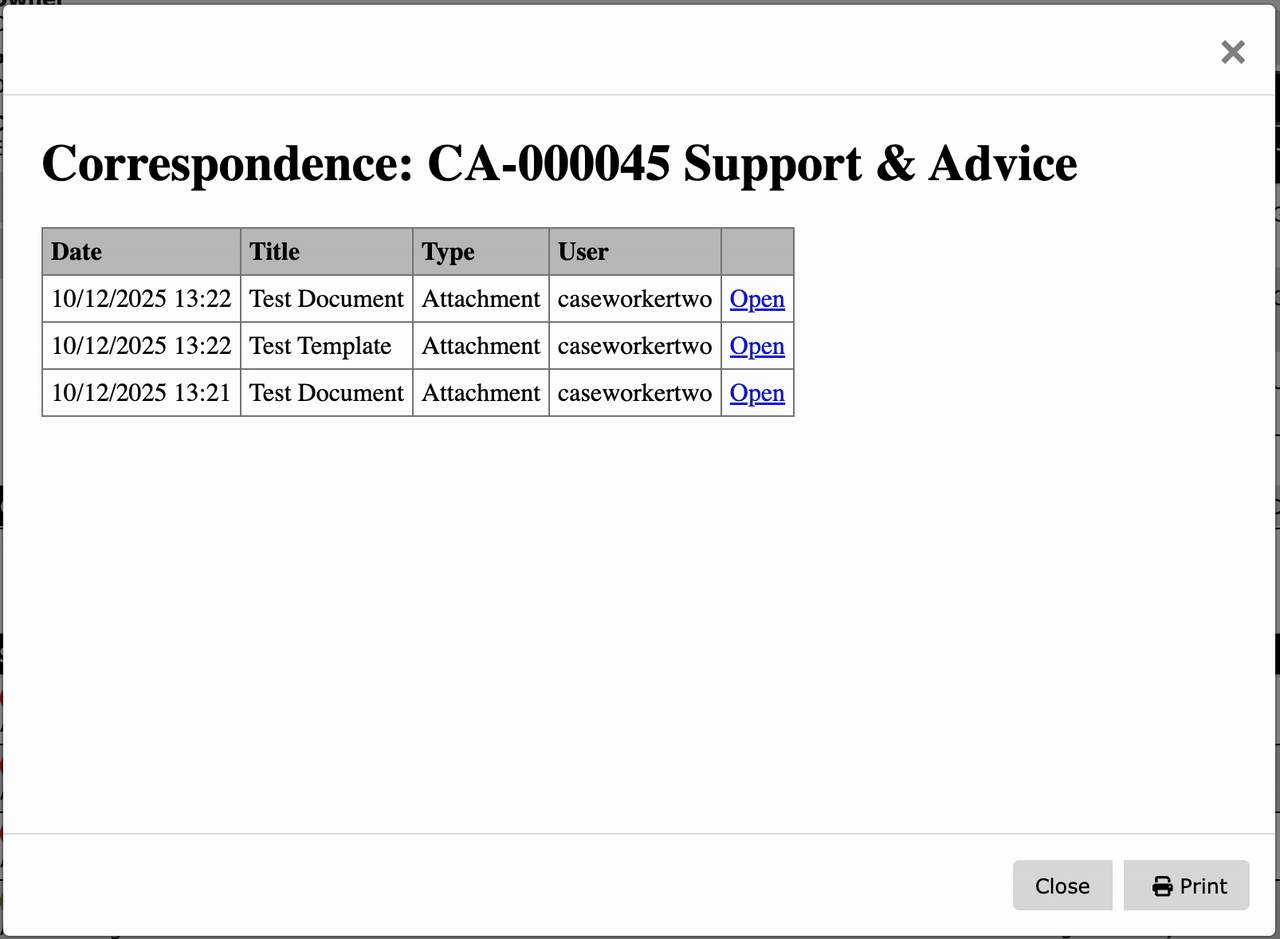 For Correspondence, a pop out window will appear and display the correspondence details as well as any attachments on the case. You can download these attachments by clicking 'Open' shown below as well as having the option to print.
